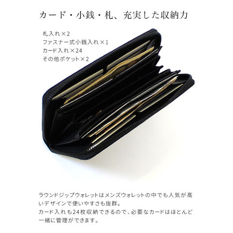 【仕様】札入れ×2、ファスナー式小銭入れ×1、カード入れ×24、その他ポケット×2