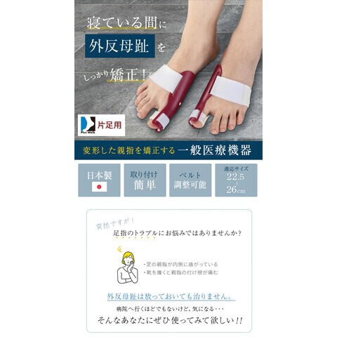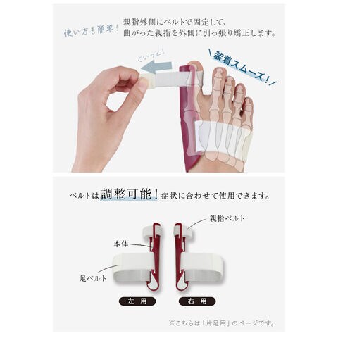 足先に体重がかからない就寝中が矯正する最適なタイミングで、足の形状に合わせた本体を親指外側にベルトで固定して曲がった親指を外側に引っ張り矯正します。