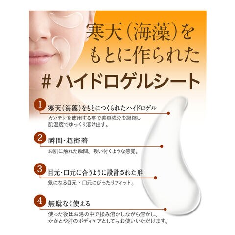 ほうれい線や目元のしわなどに、貼るだけでしっかりぷるぷる保湿ケアができる部分パック。本品は厚みのある「寒天」タイプを採用。コットンやシリコンとは違い、寒天は重量の100倍の水分を抱え込む保水力を誇ります。また、お肌にピタッと密着し、寒天が溶けると皮膚の上で膜の役割を果たし、水分の蒸発も防いでくれます。