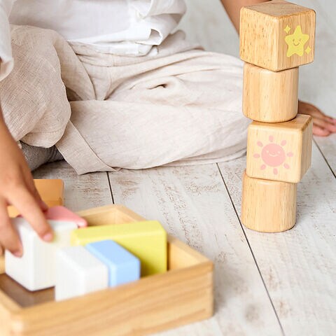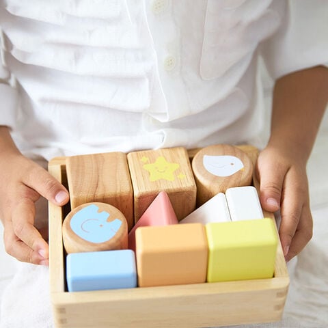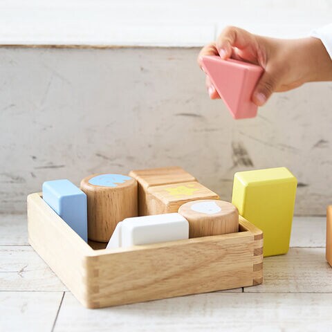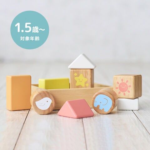 天然木ならではのぬくもりと、目を引くイラストが魅力。遊びながら五感を刺激し、手先の発達や想像力を育みます。