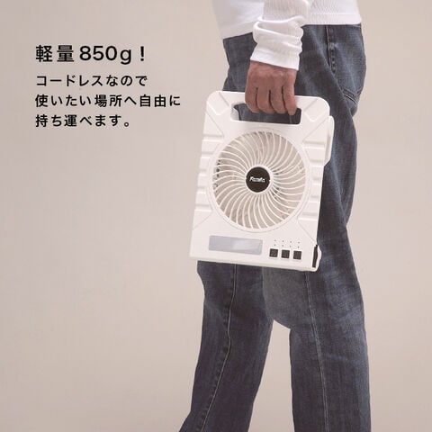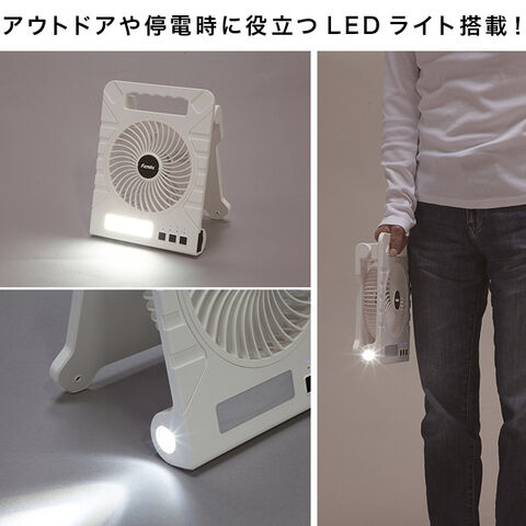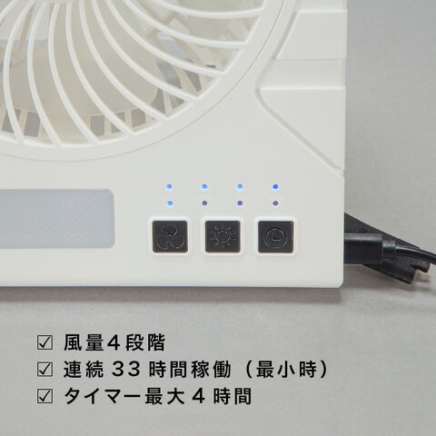 【仕様】[防水性能]IPX3 [電源]USBケーブル(Type-C)、ACアダプター、ソーラー充電 [内蔵バッテリー]リチウムイオンバッテリー(10000mAh/3.7V) [消費電力]最大約10W [充電時間]USBケーブル使用時(約8時間)、ソーラー使用時(約1.5日) [連続使用時間]最大約33時間(最小風量使用時) [風量調整]4段階切り替え [タイマー機能]最大4時間設定可能 [ライト機能]スポットライト、広角LEDライト(3段階) [モバイルバッテリー機能]USB出力ポートでスマートフォンなどの充電可能 [角度調整]スタンド角度調整可能
