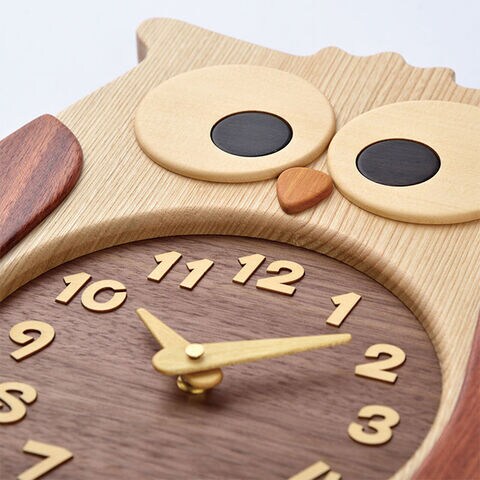 1-2W ふくろう時計(フクロウ 時計 振り子時計 ウォールクロック 壁掛け時計 振り子 掛け時計 おしゃれ かわいい ウッド アナログ 壁掛け 木製時計 ふくろうグッズ 鳥 木の時計 木目調 ナチュラル 日本製 寄せ木)