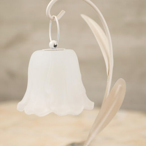 葉っぱ型の本体にガラスの花が揺れるようにあしらわれた、やさしい雰囲気のフラワーランプ。
