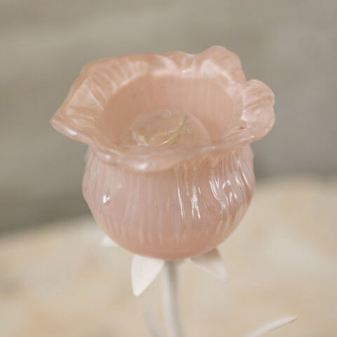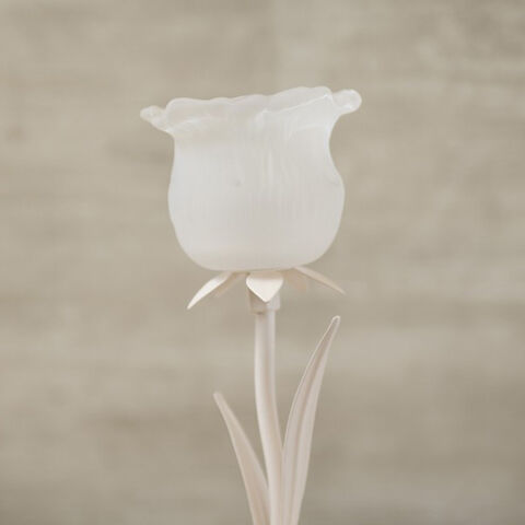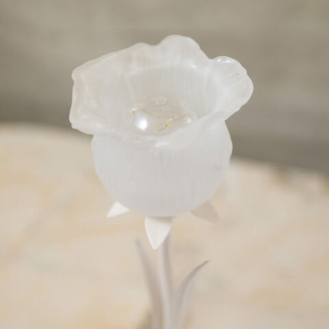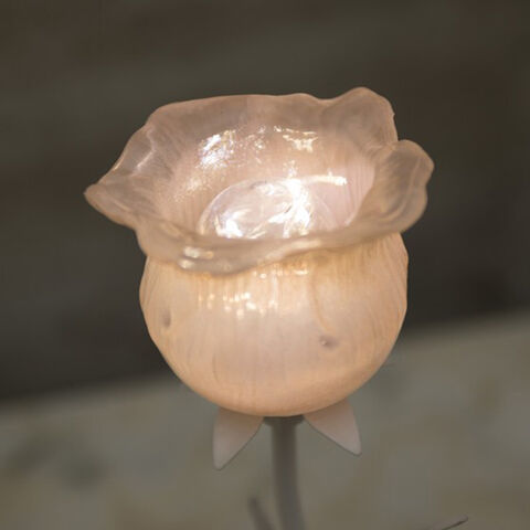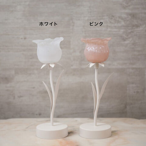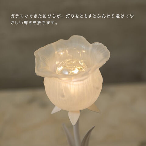 チューリップ型のデザインが印象的なフラワーランプ。置くだけで空間にやさしい彩りと上品さをプラスし、インテリアのアクセントとして楽しめます。灯りをともすとガラスの花びらがほんのり透け、穏やかな光が広がり、リラックスタイムに最適。スリムで省スペース設計のため、玄関やベッドサイドにも置きやすいサイズ感です。