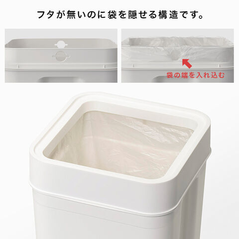 外から見えることのない袋の端、広くて捨てやすい投入口、そして空間になじむミニマルデザイン。見た目だけでなく、機能面にも細やかな配慮が詰まっています。