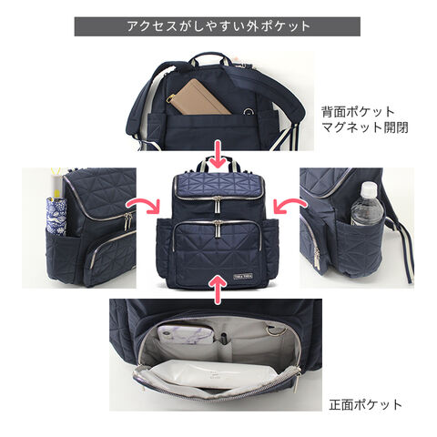 ベビーのオムツや着替え、哺乳瓶、水筒、おもちゃ、財布、母子手帳、A4雑誌、筆記用具、ポーチ類、折りたたみ傘…などなど、育児用品がすっぽり収まります。おむつ替えシートが付属。