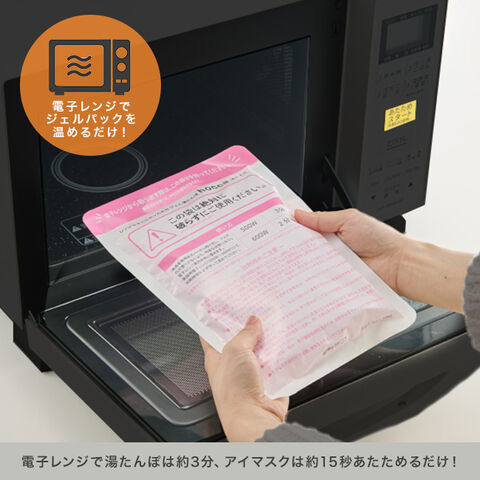 ジェルパックを電子レンジで温めるだけ。湯たんぽは約3分、アイマスクは約15秒で心地よい温かさに。