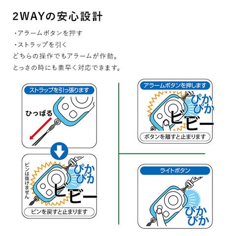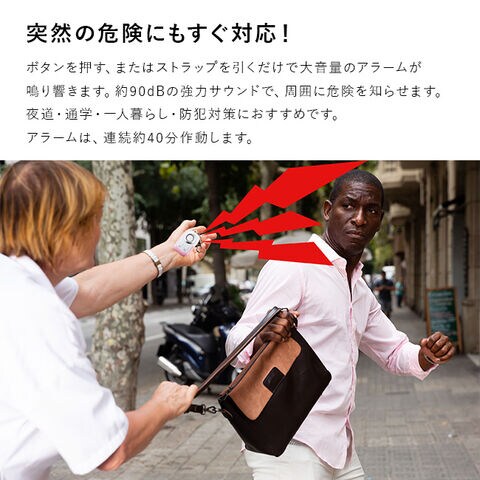 ボタンを押す、またはストラップを引くだけで大音量のアラームが鳴り響きます。