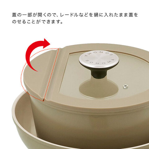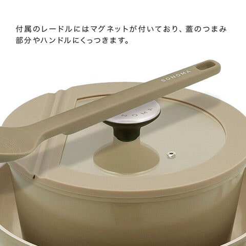 【素材】[フライパン・ポット]本体:アルミニウム合金、内・外面:セラミック塗膜加工+ダイヤモンドコート [ガラス蓋]蓋:全面物理強化ガラス、つまみ:フェノール樹脂、ステンレス [着脱式ハンドル]ハンドル:シリコーン塗装、ボタン:ステンレス430 [調理スプーン]本体中芯・本体表面:ナイロン、持ち手穴:シリコン、ナイロン