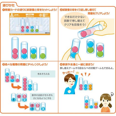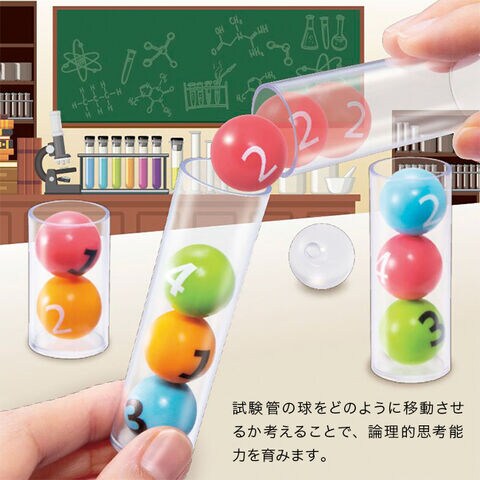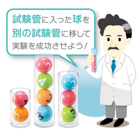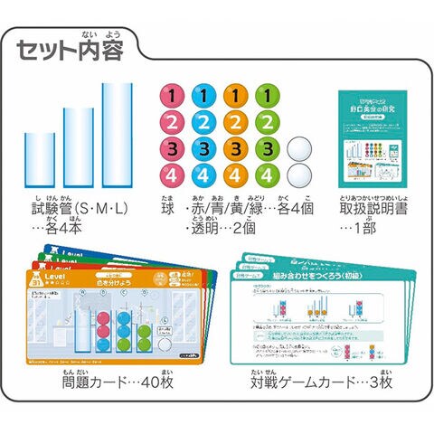 【セット内容】試験管(S・M・L)×各4本、球(赤・青・黄・緑)×各4個、球(透明)×2個、取扱説明書、問題カード×40枚、対戦ゲームカード×3枚