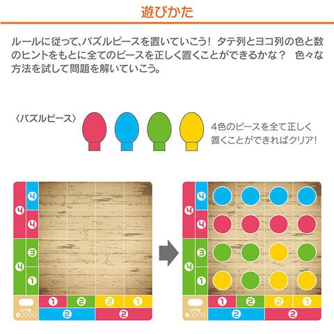 【セット内容】本体ケース(ゲーム盤)、問題カード×20枚、パズルピース(4色)×各4個、取扱説明書兼解答集