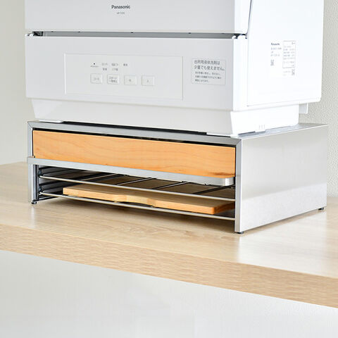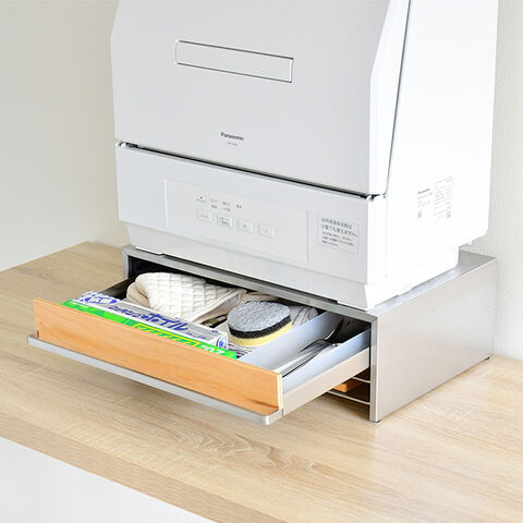 ●食洗機の下のスペースを活用!奥まで取り出し可能な引き出し付きと、引き出し下にあるステンレスワイヤー(棚板)2枚を装備。ステンレスワイヤー部は、洗い終わったまな板やトレイの指定位置として便利です。