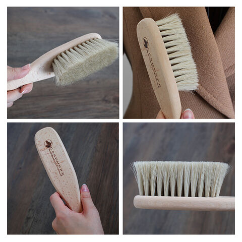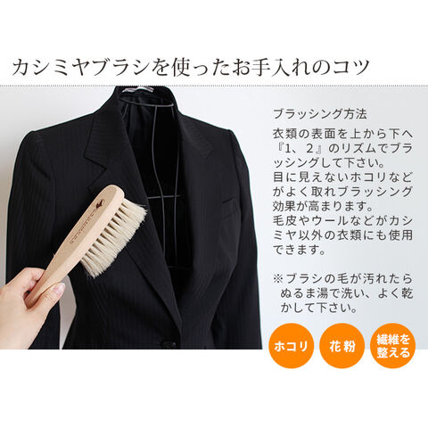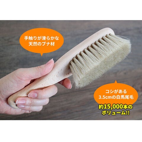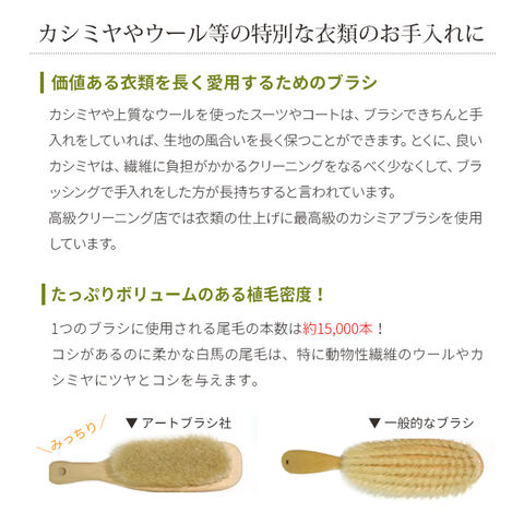 最高級の白馬の尾毛が使われた、熟練職人の手作りです。1つのブラシに使用される尾毛の本数は約15,000本!隙間がないほど密集して植毛されており、3.5cmの長さにきれいに切り揃えられています。長さがあるので少ないブラッシング回数でもきちんとしなり、衣類(繊維)の奥の細かいホコリや汚れを払うことができます。コシがあるのに柔かな馬の尾毛は、特に動物性繊維におすすめ。ウールやカシミアなどの衣類(繊維)の風合いを整え、艶を蘇らせます。高級クリーニング店のプロも仕上げに使用する最高級カシミヤブラシです。