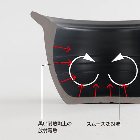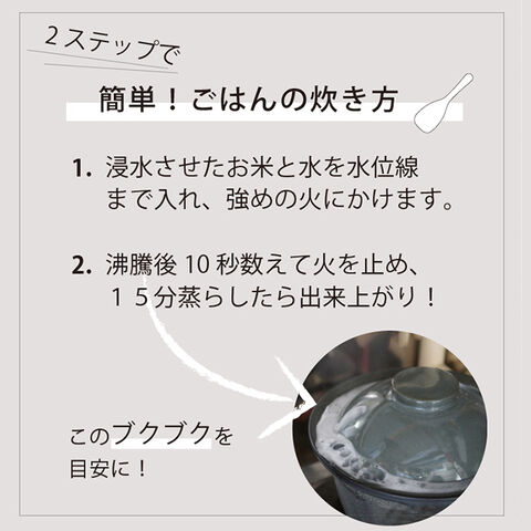 内側に水量のメモリがついています。お米と水をセットして、中強火にかけて沸騰したら火を止めるだけ。その後15~16分蒸らして出来上がりです。放射伝熱に優れた黒土と、約1cmの鍋の厚みが高温でじわじわと熱を通し、旨味を閉じ込め、ふっくらもちもちのご飯に仕上げます。また、内側の丸みが対流を起こして、むらのない炊き上がりを実現します。