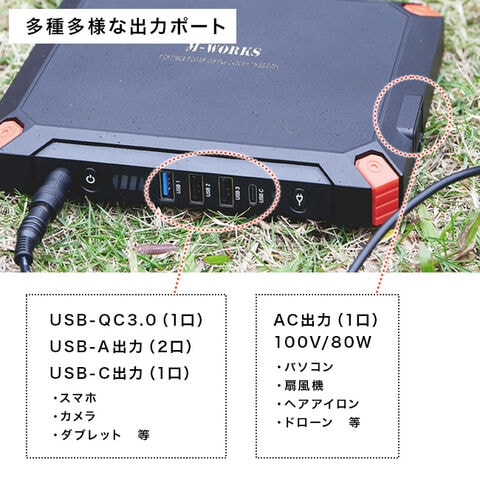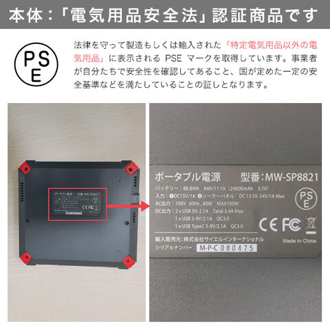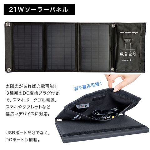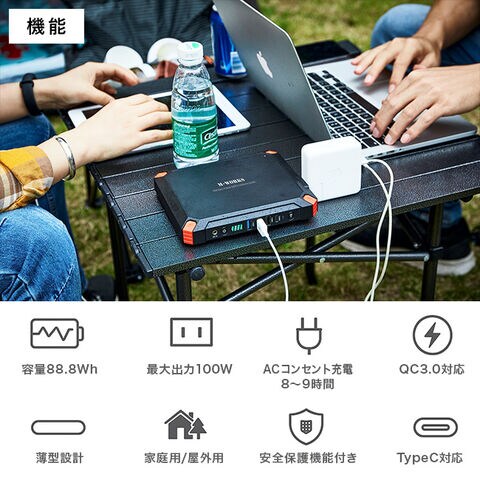 【仕様】[バッテリー]リチウムイオン [バッテリ容量]88.8Wh 24000mAh 3.7V [入力]DC DC13.5V~24V/1A(最大) [USB出力]USB×2 5V-2.1A、USB×1 5-9V/2.1A(QC3.0)、USB-C×1 5-9V/2.1A(QC3.0) [AC出力]100V/60Hz・80W/100W(最大) [充電時間]約8~9時間 [充電回数]500回 [ソーラーパネル容量]21W [ソーラーパネル出力]DC18V(MAX)、USB5V(MAX)