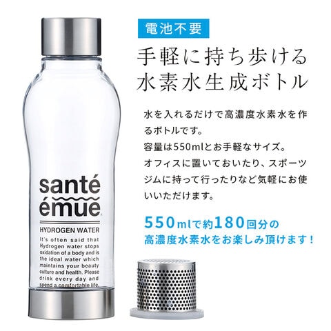 【注意】※サンテエミューで水素水ができるのは、お水(ミネラルウォーター・水道水・お湯)に限られます。※水素発生カートリッジを洗剤や薬品で絶対に洗わないでください。※ボトルにお水を入れて長期間の保存はおやめください。(※お水の味が変化する場合があります。)