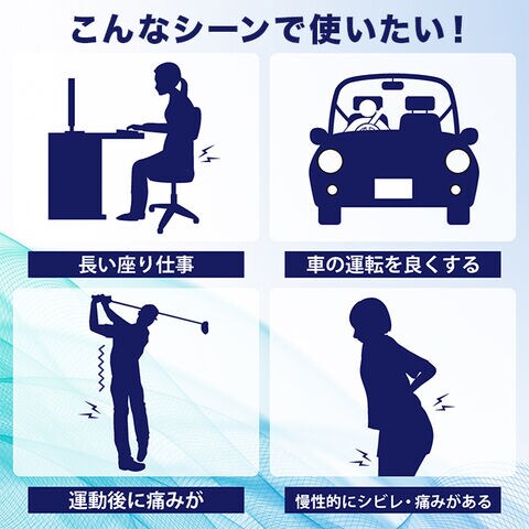 ・左右の特殊パッドで体圧を分散し、座った時の痛みやシビレをやわらげます。