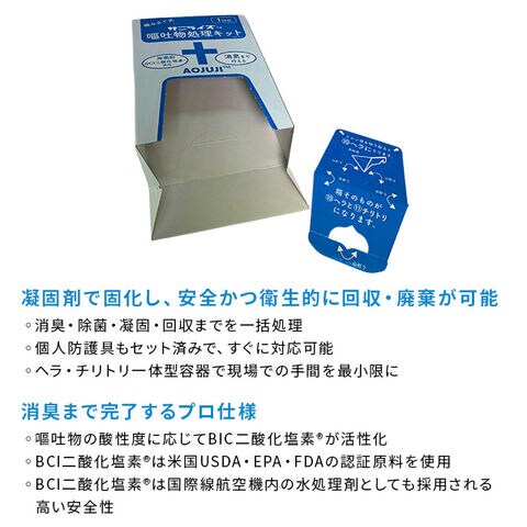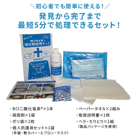 【セット内容】BCI二酸化塩素、凝固剤、ポリ袋×2枚、手袋、ペーパータオル×2組、靴カバー、エプロン、マスク、取扱説明書、ヘラ(パッケージから切り離す)、チリトリ(パッケージを使用)