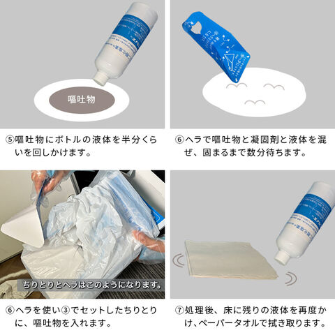 ・嘔吐物の吸収、凝固、回収、廃棄までを一括で行えるセット内容