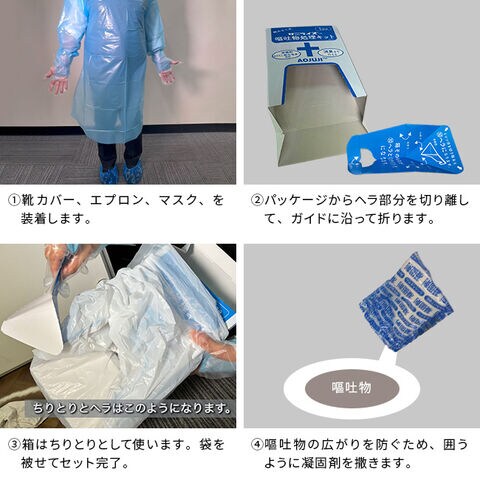 ・ポリ袋、手袋、マスク、エプロン、ペーパータオル、靴カバーを同梱