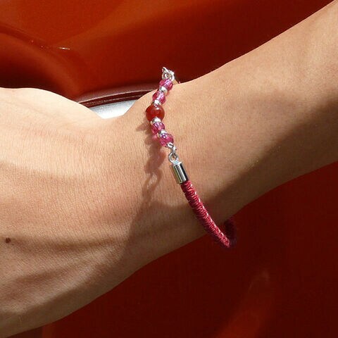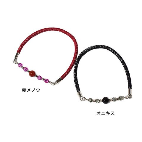 【素材】[本体]真鍮、合金メッキ(スズ・銅)、クリスタルガラス、天然石(赤メノウorオニキス) [紐部]サンダーロンSSミシン糸(ポリエステル、アクリル)、ナイロン