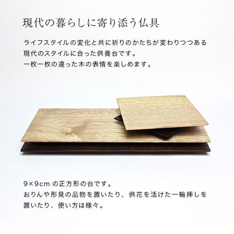 コンパクトなサイズ感は、ミニ骨壷やおりん、一輪挿しなどの仏具を置く台座として適しています。