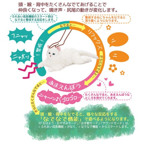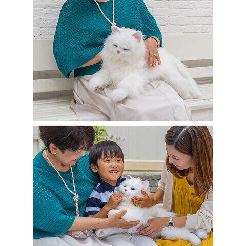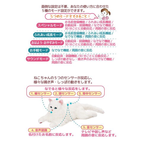 猫そっくりな外見としぐさを楽しむペットロボットです。尻尾の動きや感情表現は100通り以上あり、お名前設定ではあなたが名付け親になれます。名前を呼ぶと反応し、ふれあい成長機能により、たくさんなでると鳴き声や尻尾の動きは変化します。自動で起床や就寝する機能もあり、活動中は30分ごとに自動で反応します。猫好きはもちろん、事情がありペットが飼えない方にもお楽しみいただけます。
