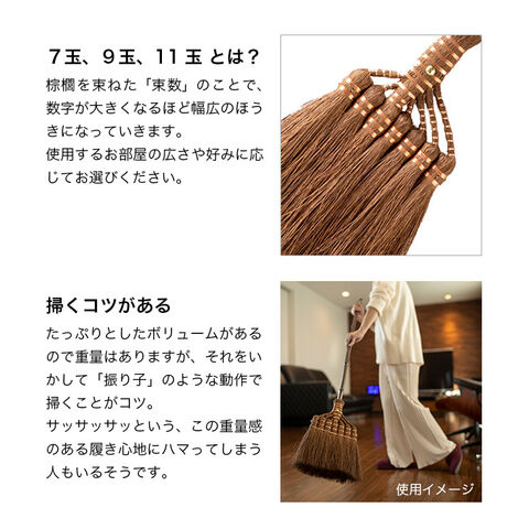 棕櫚箒はお座敷箒ですが、板間(フローリング)の掃除にも適しています。穂先をいかして、穂先が床面に当たるように床を撫でるように軽く掃いて下さい。細い繊維で細かなゴミや埃、髪の毛などを集めることが出来ます。難しいお手入れは不要で、使い終わったら紫外線の当たらない風通しの良い涼しい場所に吊るして下さい。素材からこだわった手作りの箒は、一度使うと手放せなくなる道具です。プレゼントにもいかがでしょうか。