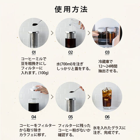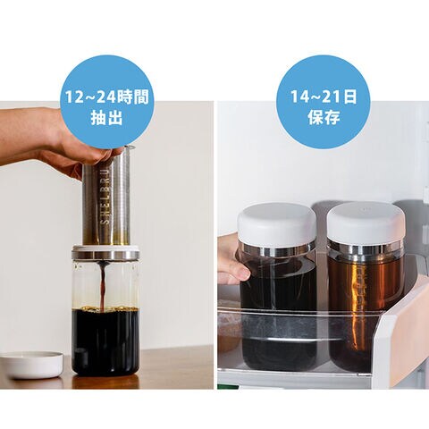 本品に、コーヒー粉と水を入れて冷蔵庫に置いておくだけでOK。約24時間で濃縮コーヒーを作ることができます。