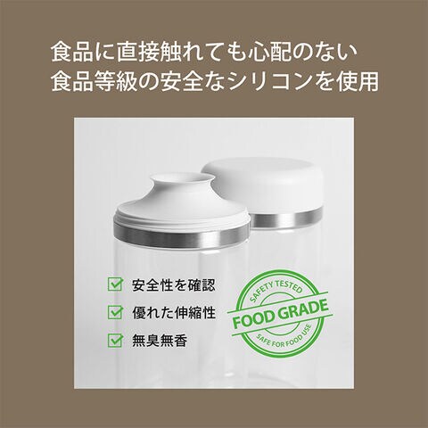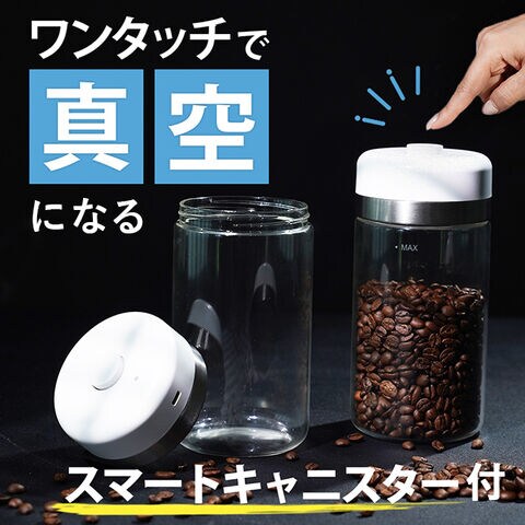 ●真空キャニスター付き。コーヒー豆や挽いた粉を保存しておくのに便利!真空から解除までがボタン1つで可能。たった15秒で真空が作れます。