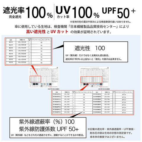 【備考】※記載の紫外線遮蔽(UVカット)率・UPF値・遮光率・耐水圧値は生地の状態での測定値であり、傘本体の性能を保証する数値ではございません。また、生地に施された縫製などのUV加工生地以外の部分も同様です。