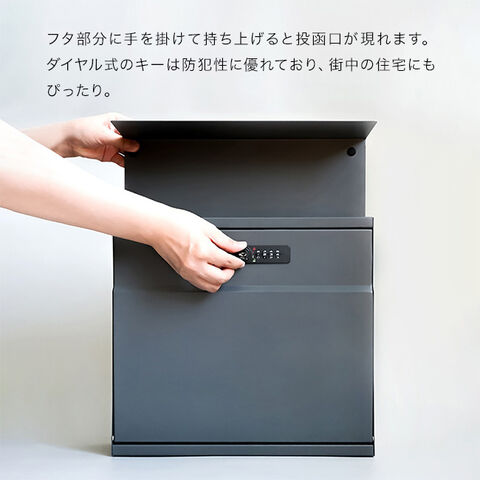 フタ部分に手を掛けて開けると、投函口が現れる構造。防犯性に優れたダイヤルロック付きで、プライバシーにも配慮されています。