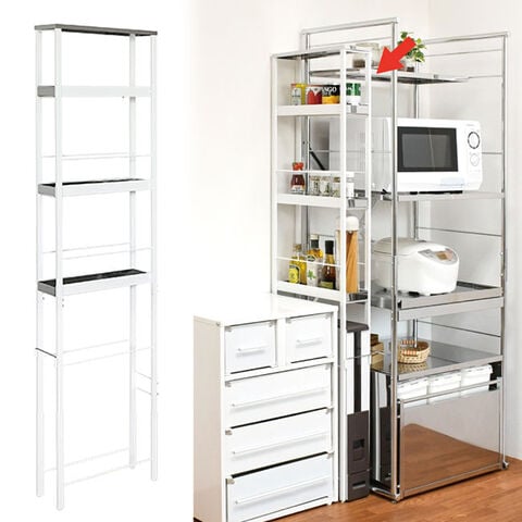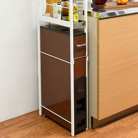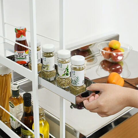 ■幅約10cmのスリムタイプで隙間を有効活用できます。缶詰や調味料はもちろん、狭さを活かして本などを置いても便利。見た目以上に多くの量を収納できます。