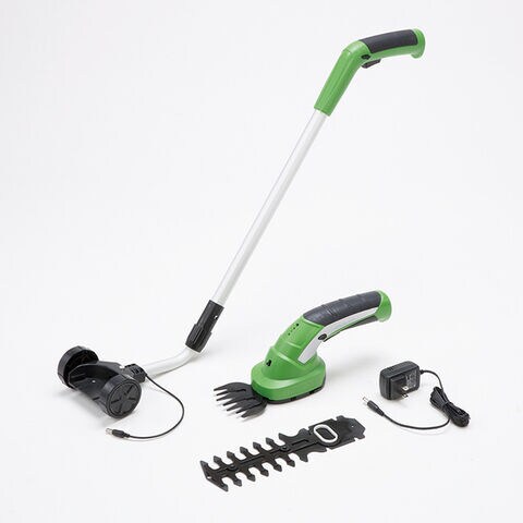 【セット内容】本体、芝生用ブレード、庭木用ブレード、芝生用ブレードカバー、庭木用ブレードカバー、延長スティック、ACアダプター、保証書付き取扱説明書