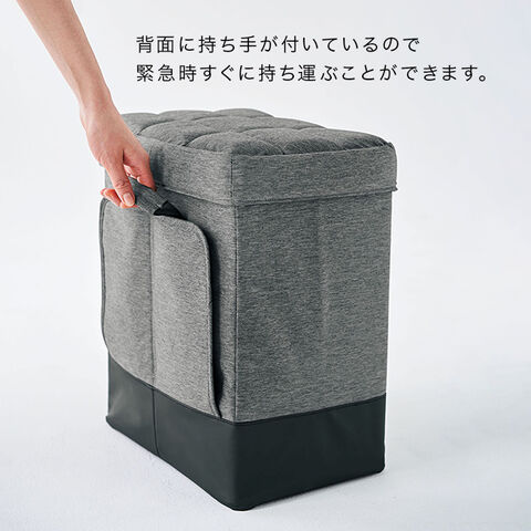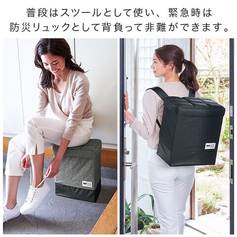 玄関に置けて、座れて、すぐ背負える。普段はスツールとして暮らしになじみ、いざという時はリュックになる、座れる防災バッグ。