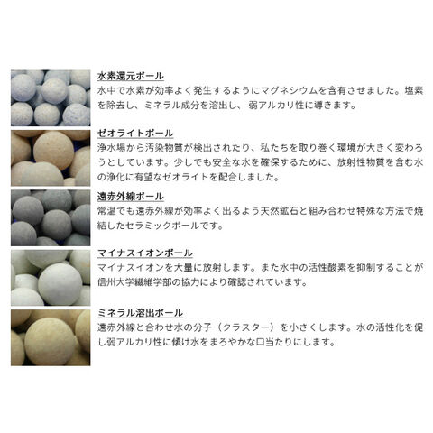 【素材】水素還元ボール7g、ゼオライトボール3g、マイナスイオンボール3g、遠赤外線ボール3g、ミネラル溶出ボール3g