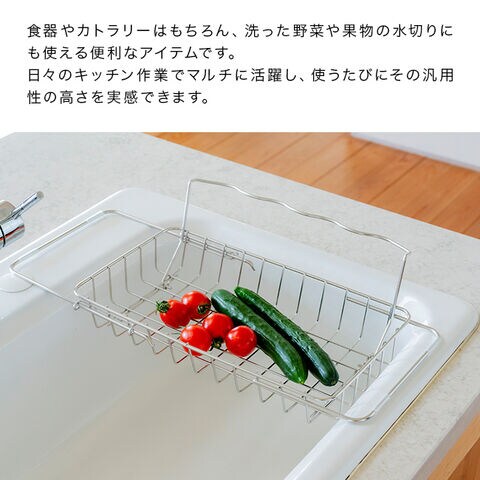 限られたキッチンスペースを有効活用できる、シンク渡しタイプの水切りかご。