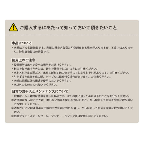 ※水盤はアルミ鋳物製です。表面に極小さな窪みや突起がある場合がありますが、不良ではありません。砂型鋳物製法の特徴です。