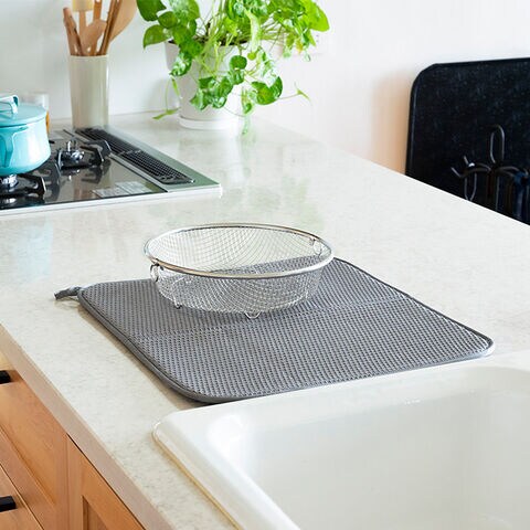 ●ポリエステル100%の厚手マットが、食器や調理器具から出る水分を素早く吸収。