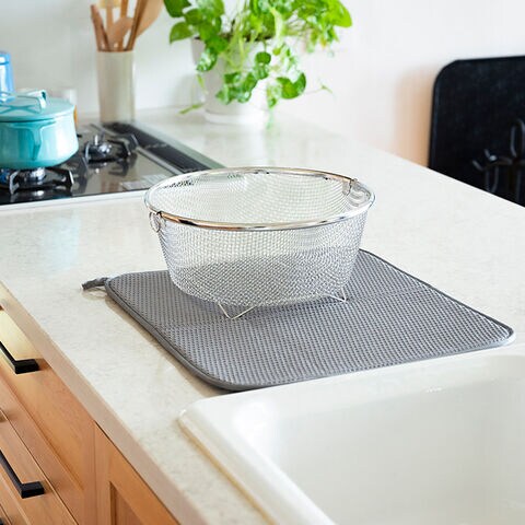 ●優れた速乾性で、使った後もすぐに乾いてお手入れラクラク。水切りかごの下に敷いても、単体で食器を置いても快適に使えます。洗濯機で丸洗いOK。