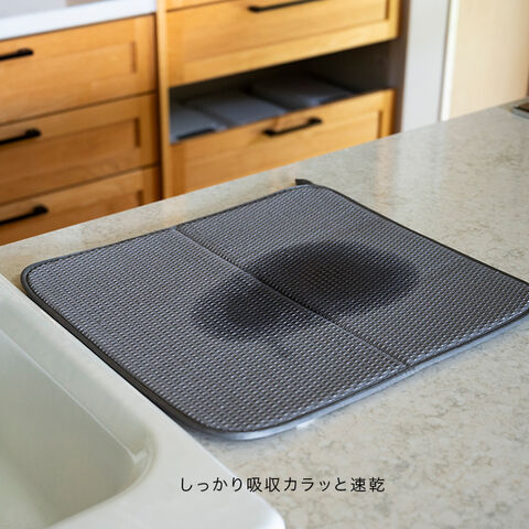 ●ポリエステル100%の厚手マットが、食器や調理器具から出る水分を素早く吸収。