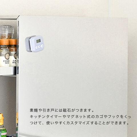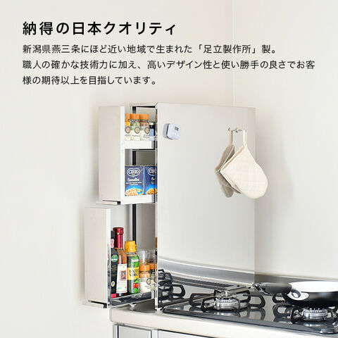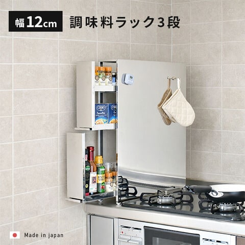 ・奥行12cmのスリム設計でコンロ横のすき間に収まる3段スパイスラック。