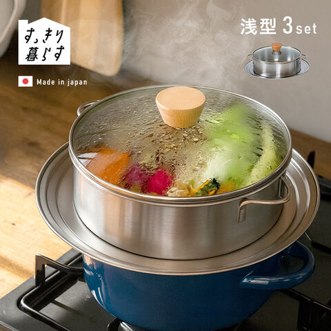 すっきり暮らす ステンレスせいろ 浅型 仕切り付き 3点セット(せいろ 蒸し器 ステンレス ステンレス製 蒸籠)