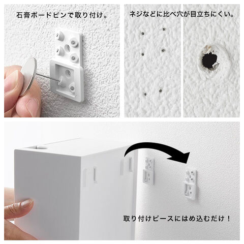 【取り付け可能な壁面】石こうボードピン使用時:壁紙・布壁紙・ビニール壁紙貼りなどの石こうボード・薄ベニヤ 木ネジ使用時:柱・板壁(厚さ1cm以上)・プリント合板(裏側に水平にサンがある場所)・裏に下地材(間柱)が入っている壁