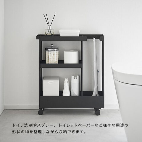 スリムなデザインでありながら、高さのあるトイレブラシや洗剤、スプレー、トイレットペーパーなど、多様なトイレ用品を3段に分けてすっきりと収納できます。
