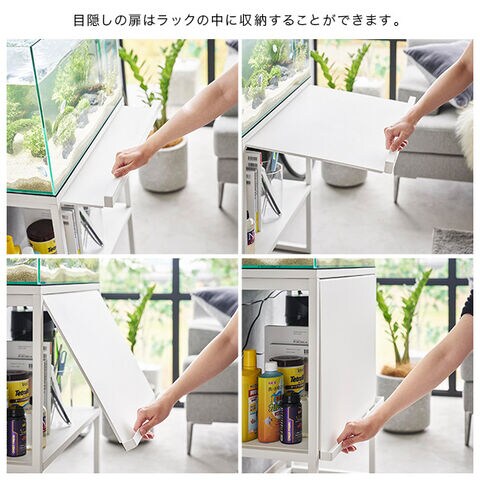 ●目隠しの扉はラックの中に収納することができます。扉は開けたまま固定可能。ちょっとした作業の備品の仮置きもできて◎。