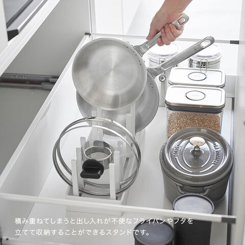シンク下・コンロ下や食器棚の整理整頓にぴったり!鍋蓋やフライパンを立ててスマートに収納できる、可動式の収納スタンドです。