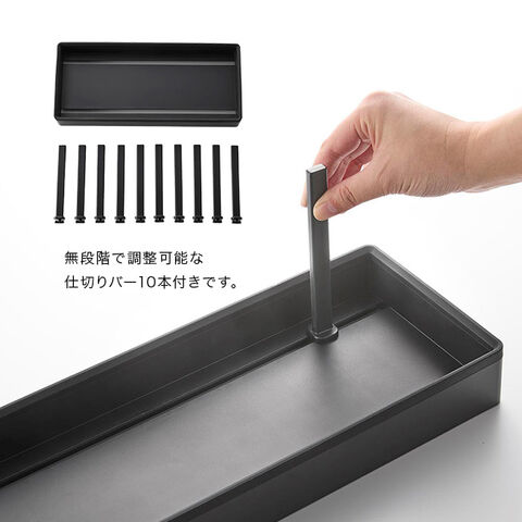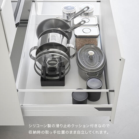 仕切りバーは無段階で調整可能な12本付き。収納物のサイズや形状に合わせて、自由にレイアウトが可能です。本体上部にはシリコーン製の滑り止めクッションが付いており、フライパンの取っ手を優しくホールドしてしっかり自立。金属同士がぶつからないので、鍋やフライパンに傷が付きにくく、出し入れの際もカチャカチャとした音が鳴りにくい静かな使用感も特長です。底面にも滑り止めが付いているため、引き出しの開閉によるズレも防止。使いやすさと安心感を兼ね備えた設計です。