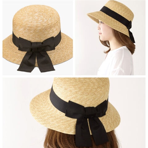 バックの結び目がワンポイントで可愛いデザイン。麦わらのナチュラルカラーにブラックリボンの定番スタイルです。