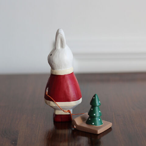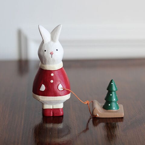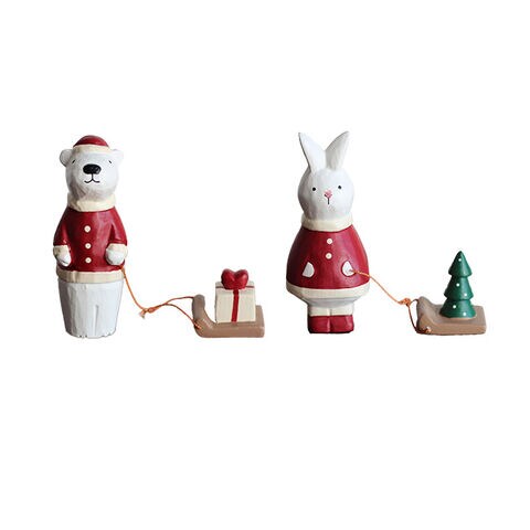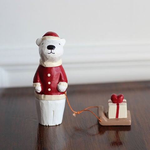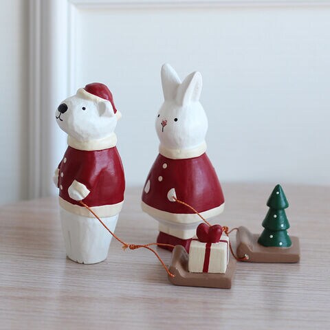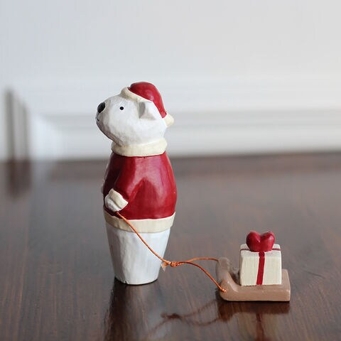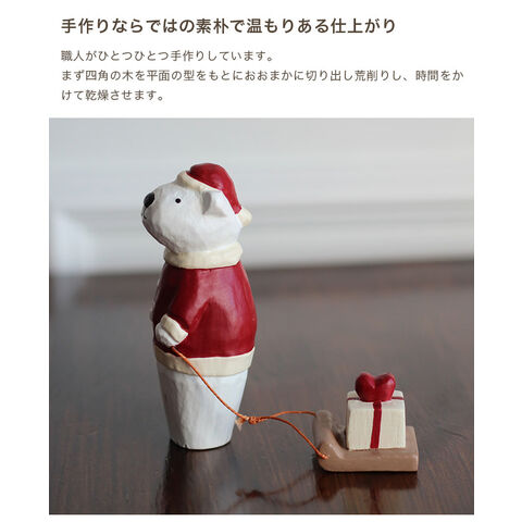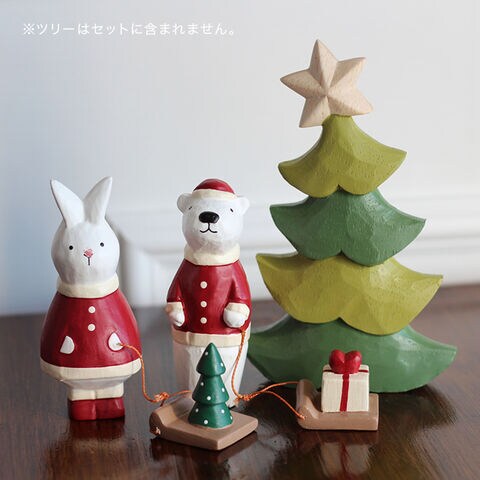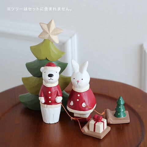 プレゼントとツリーをのせたソリを引く、白くま&ウサギの小さな置き物です。